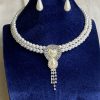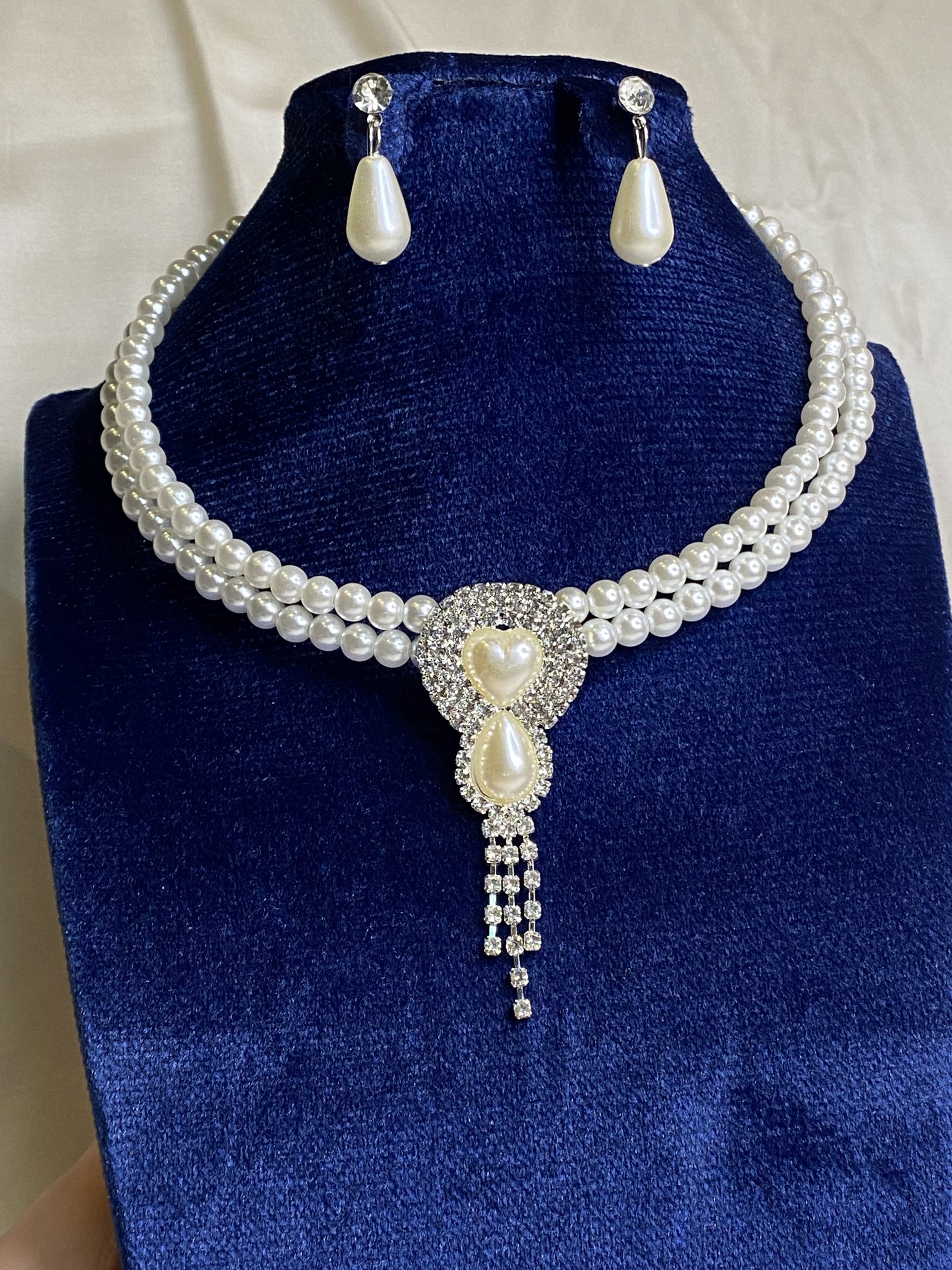 This beautiful pearl choker set features to rows of glossy faux pearls with a sparkling center piece made of a heart shape and tear drop pearl. Crystal accents and a delicate hanging tassel add a touch of glamour. This set includes matching tear drop pearl earrings making it perfect for weddings, parties and special occasions.